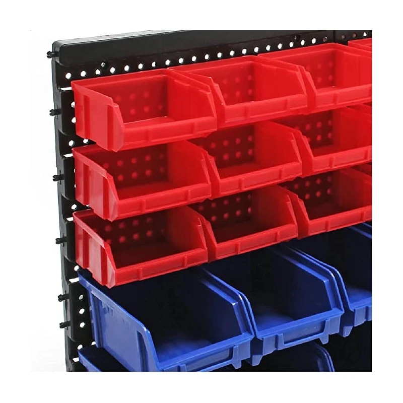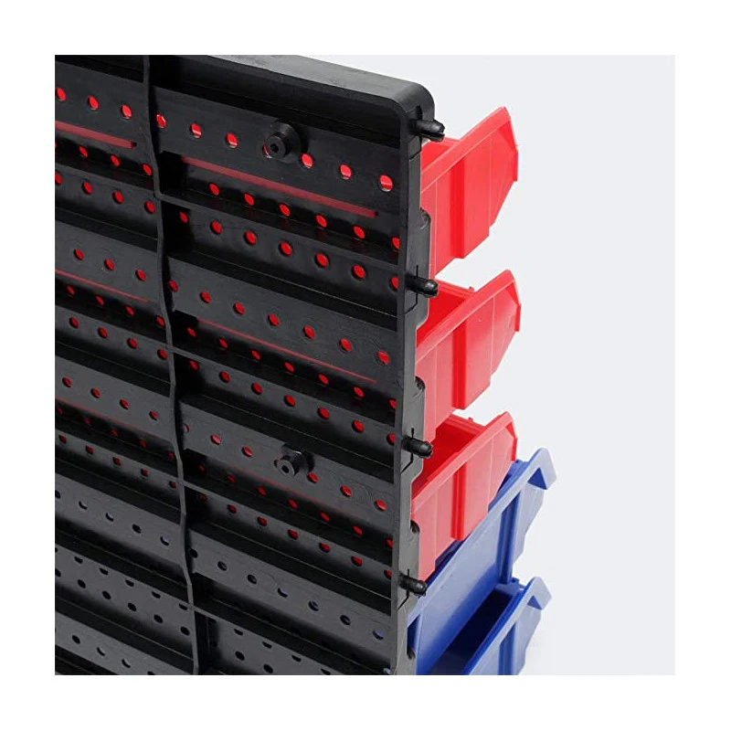 Meuble de rangement pour un atelier rangé et organisé, en polypropylène solide et composé de 18 petits bacs et 12 grands bacs faciles à poser sur la plaque de soutien.