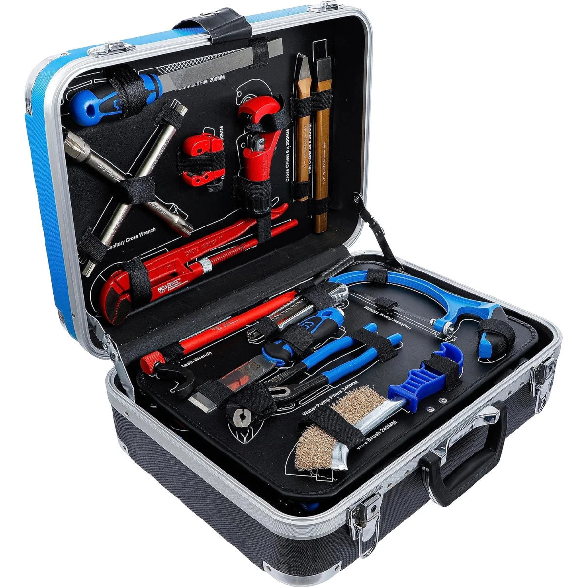 - Douilles, rallonge, cliquet réversible, pince multiprise, serre-tubes coudé et clé plate, fabriqués en acier chrome-vanadium.