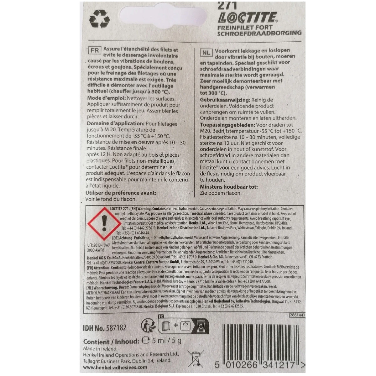 - LOCTITE 271 est un frein filet à base méthacrylate avec une viscosité faible et une résistance élevée. Idéal pour les applications ou la migration de produit doit être évitée.