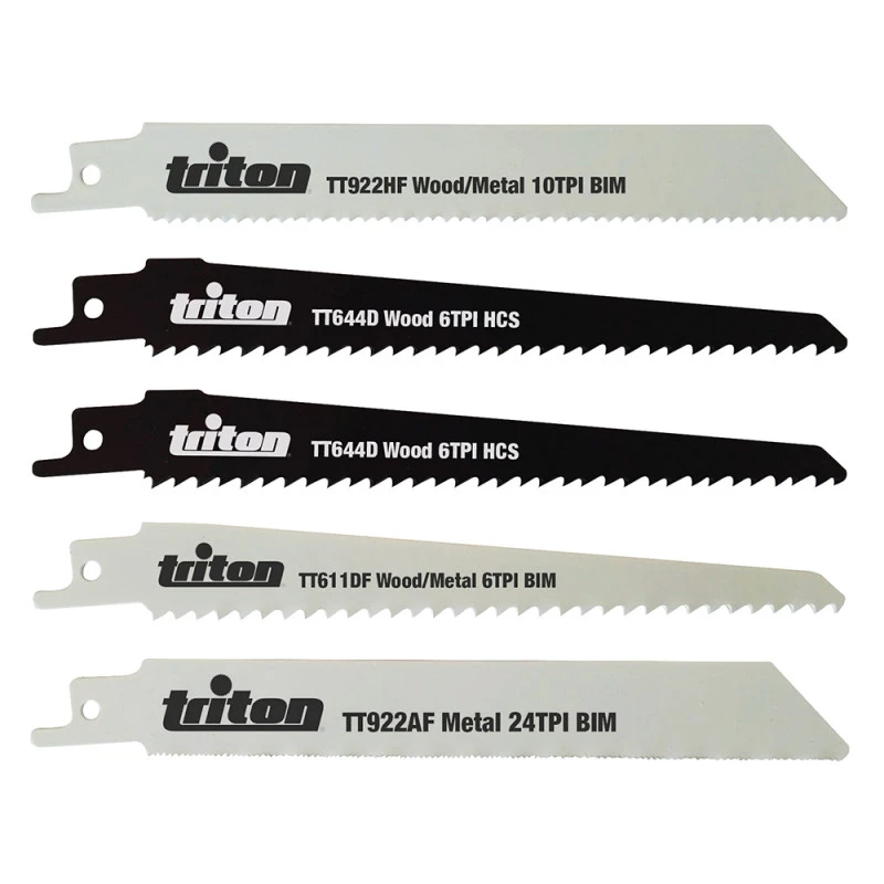 Ensemble de 5 lames Triton comprenant les dimensions les plus utilisĂ©es, et compatibles avec toute scie-sabre Ă emmanchement universel 1/2″.