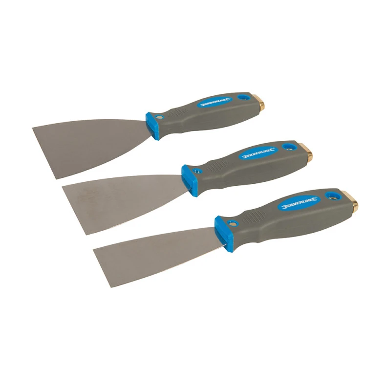 Lot de 3 couteaux à enduire ou à mastiquer à lame en acier ressort trempé résistant à la corrosion.