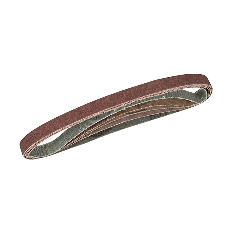 Paquet de 5 bandes abrasives assorties 13 x 457 mm, compatibles avec les ponceuses à bande de 13 X 457 mm.