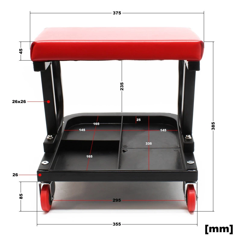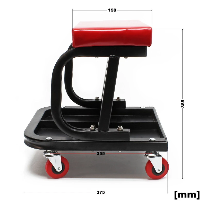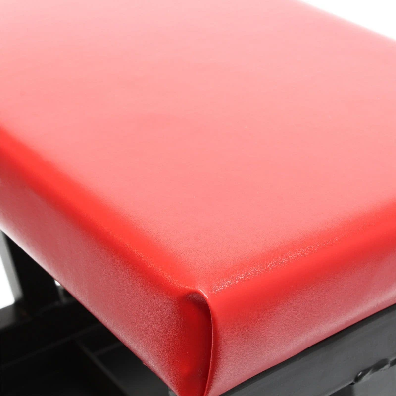 Tabouret roulant d’atelier, très pratique grâce à son porte-outils, avec assise confortable.